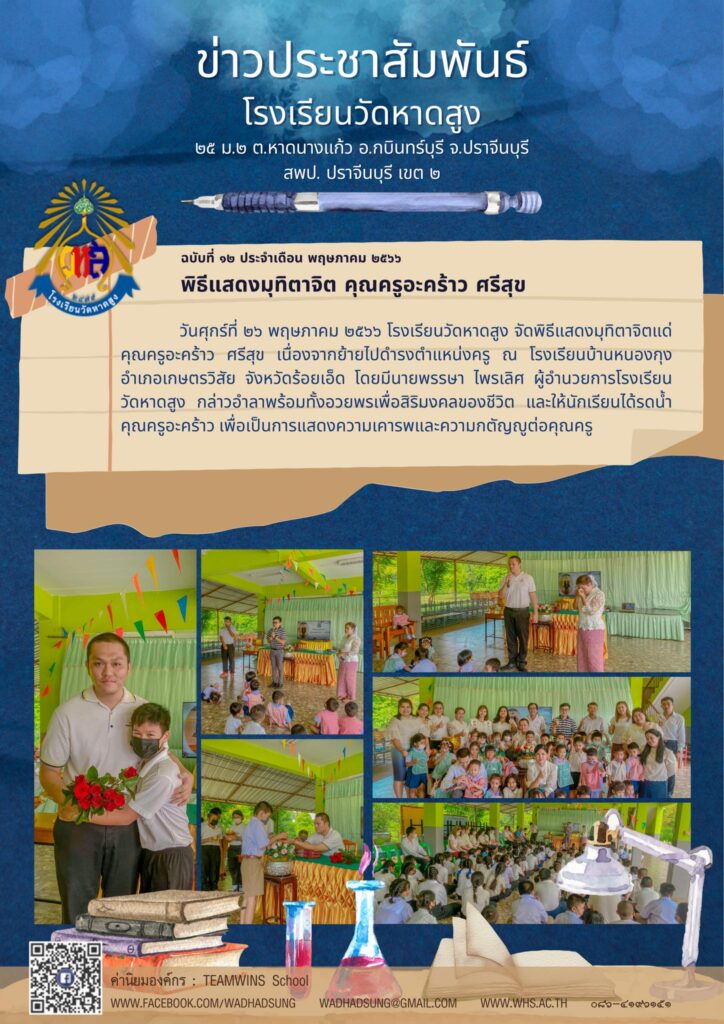 วันศุกร์ที่ ๒๖ พฤษภาคม ๒๕๖๖ โรงเรียนวัดหาดสูง จัดพิธีแสดงมุทิตาจิตแด่คุณครูอะคร้าว ศรีสุข เนื่องจากย้ายไปดำรงตำแหน่งครู ณ โรงเรียนบ้านหนองกุง อำเภอเกษตรวิสัย จังหวัดร้อยเอ็ด โดยมีนายพรรษา ไพรเลิศ ผู้อำนวยการโรงเรียน วัดหาดสูง กล่าวอำลาพร้อมทั้งอวยพรเพื่อสิริมงคลของชีวิต และให้นักเรียนได้รดน้ำคุณครูอะคร้าว เพื่อเป็นการแสดงความเคารพและความกตัญญูต่อคุณครู