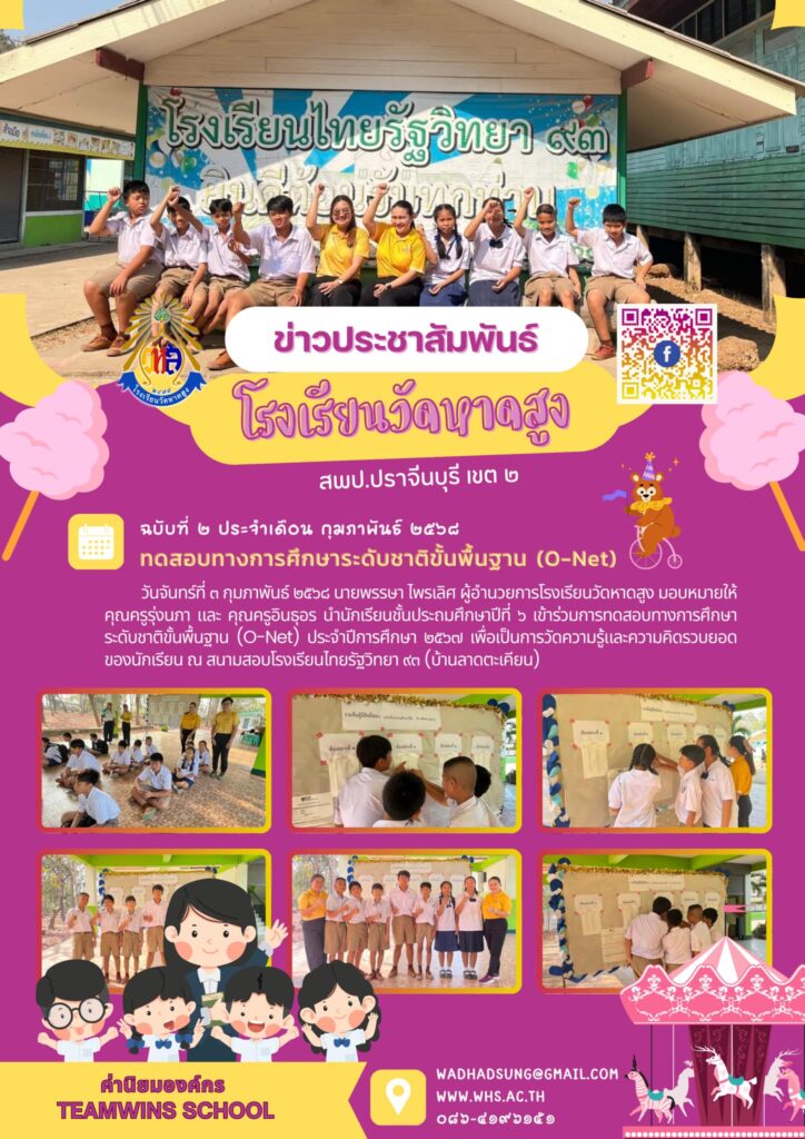 วันจันทร์ที่ ๓ กุมภาพันธ์ ๒๕๖๘ นายพรรษา ไพรเลิศ ผู้อำนวยการโรงเรียนวัดหาดสูง มอบหมายให้ คุณครูรุ่งนภา และ คุณครูอินธุอร นำนักเรียนชั้นประถมศึกษาปีที่ ๖ เข้าร่วมการทดสอบทางการศึกษาระดับชาติขั้นพื้นฐาน (O-Net) ประจำปีการศึกษา ๒๕๖๗ เพื่อเป็นการวัดความรู้และความคิดรวบยอดของนักเรียน ณ สนามสอบโรงเรียนไทยรัฐวิทยา ๙๓ (บ้านลาดตะเคียน)