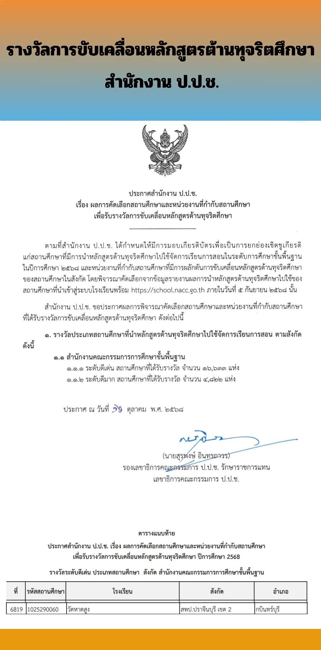 ผลงานต่างๆ รางวัลการขับเคลื่อนหลักสูตรด้านทุจริตศึกษา ระดับดีเด่น 28 ตุลาคม 2025 admin รางวัลการขับเคลื่อนหลักสูตรด้านทุจริตศึกษา ระดับดีเด่น #สำนักงานคณะกรรมการป้องกันและปราบปรามการทุจริตแห่งชาติ