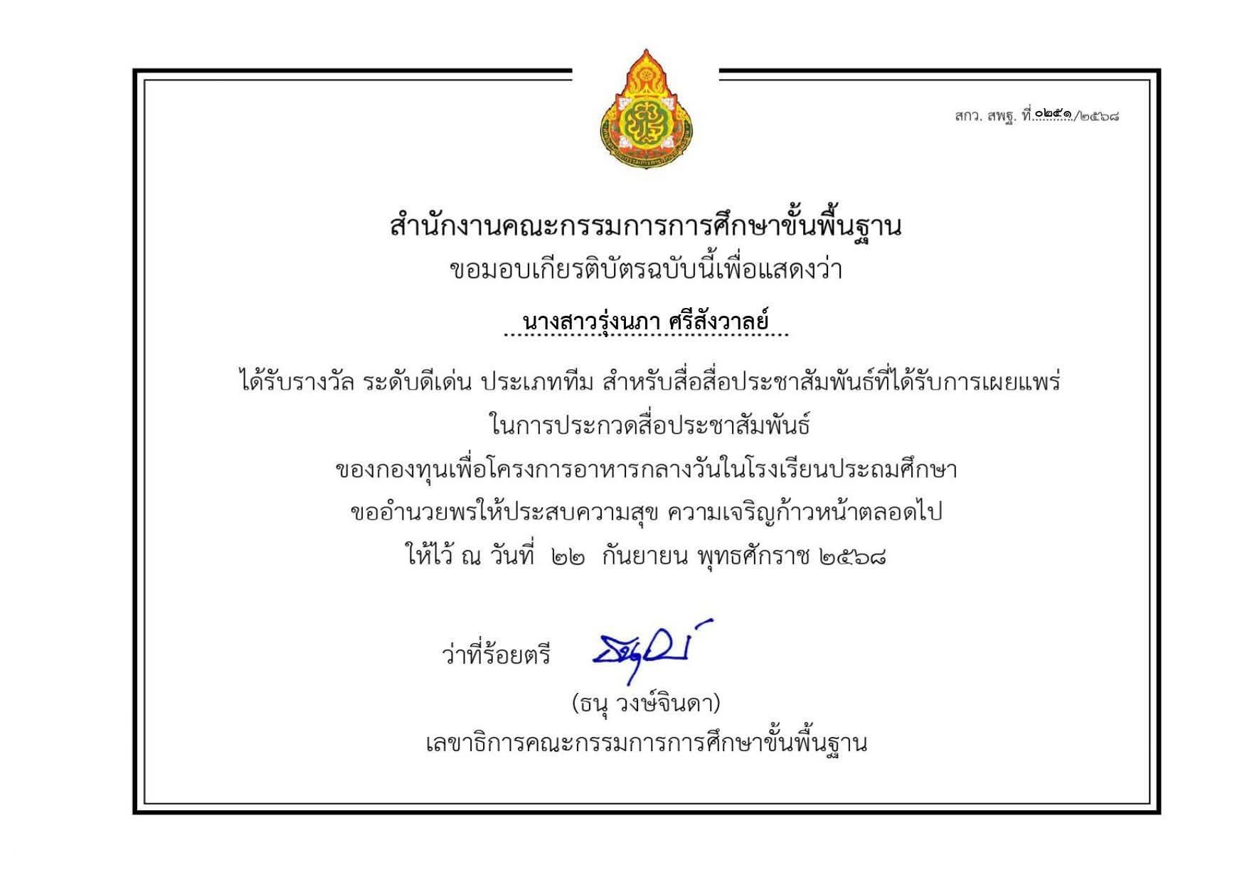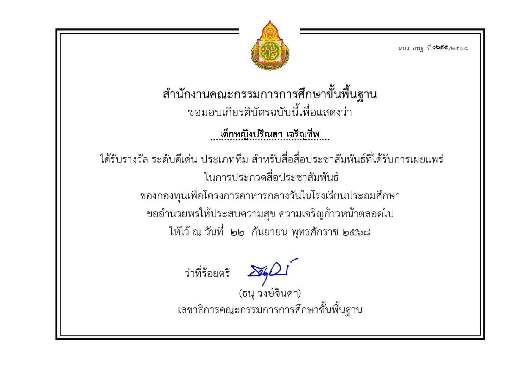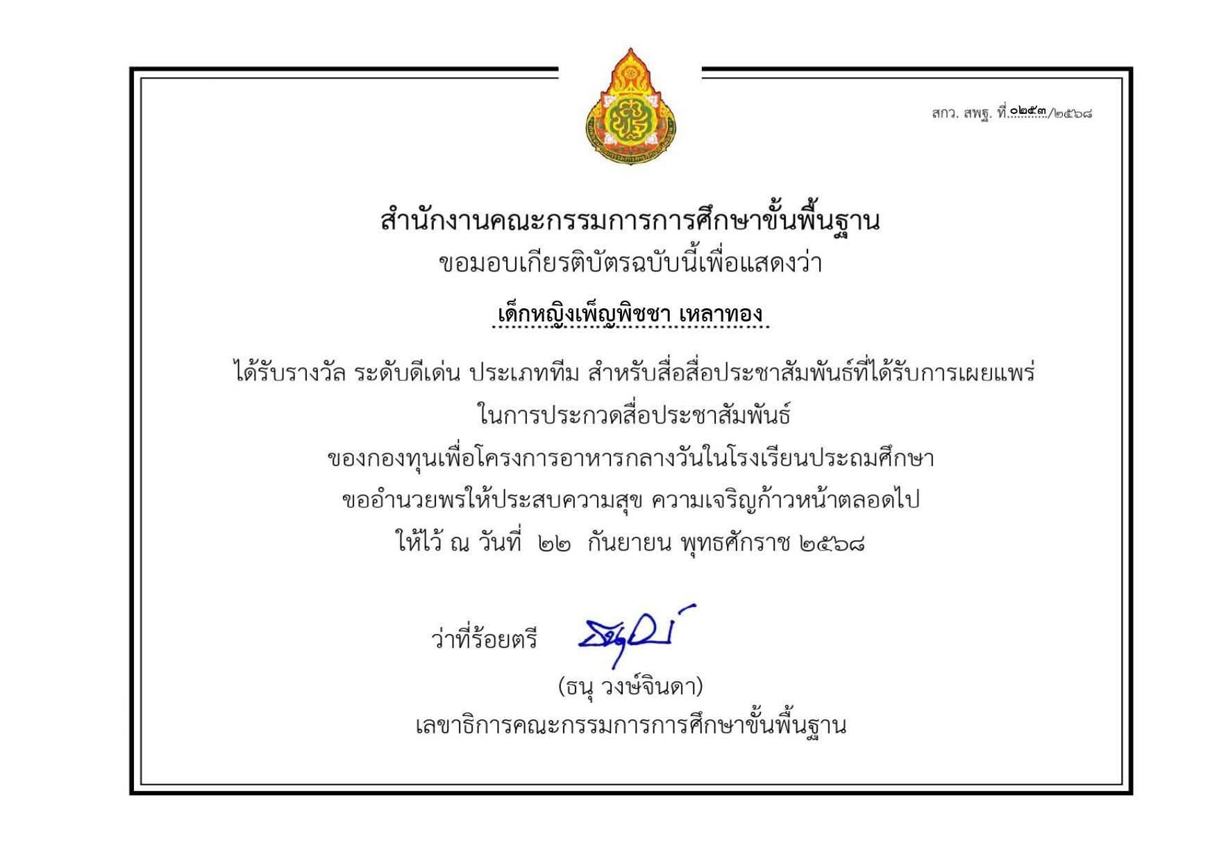 ผลงานต่างๆ เกียรติบัตร Wadhadsung Team ผักปลอดภัยไร้กังวล 🥬🥕🥗🍆🥒🍅 24 ธันวาคม 2025 admin รางวัลระดับดีเด่น ประเภททีม สำหรับสื่อประชาสัมพันธ์ที่ได้รับการเผยแพร่ในการประกวดสื่อประชาสัมพันธ์ของกองทุนเพื่อโครงการอาหารกลางวันในโรงเรียนประถมศึกษา #สำนักงานคณะกรรมการการศึกษาขั้นพื้นฐาน